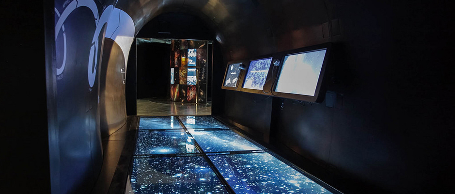 Nuovo exhibit a galleria che diventa un’unica area didattica, sperimentale e sensoriale allo stesso tempo. Ai visitatori verrà data la possibilità di approfondire la loro conoscenza sulle deformazioni provocate allo spazio tempo dalle masse attraverso filmati trasmessi dai monitor posti sui lati lunghi della struttura. L’esperienza visiva di questa deformazione viene anche ricreata attraverso la visualizzazione su un pavimento a monitor Led interattivo che si anima al passaggio del visitatore e che occupa metà dello spazio interno.