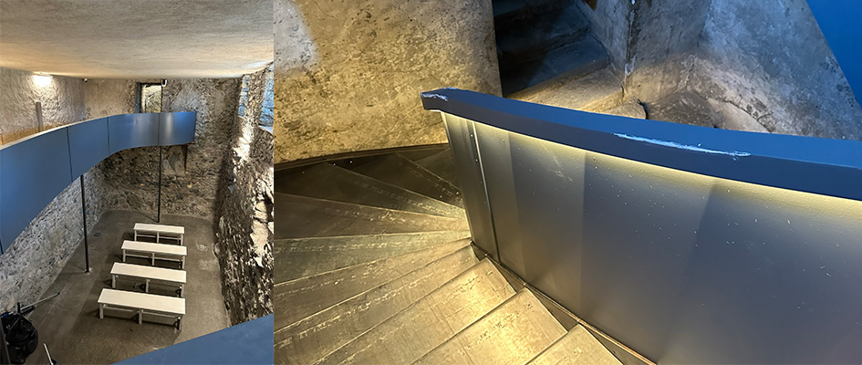 La nuova distribuzione planimetrica si struttura attorno ad un nuovo passaggio, cioè alla realizzazione di una passerella che collega l’area nord con l’area sud. Questo nuovo passaggio è suggerito da alcuni elementi presenti nella sala chiamata “Grand cellier” al piano seminterrato che sono: una nicchia tamponata, dei fori che potrebbero essere quelli di una struttura di sostegno orizzontale, un intonaco nettamente interrotto ad un livello come se vi fosse stato un pavimento. Si realizza così un nuovo percorso di visita che partendo dall’ingresso in corrispondenza della nuova biglietteria, conduce, attraverso la passerella, alla cappella a sud. Grazie a questo collegamento il percorso di visita inizia e termina nello stesso punto, nella seconda torre a nord, permettendo nuove e più interessanti prospettive di uso. È stato effettuato inizialmente un rilievo metrico e approfondito del Castello e del quadro fessurativo generale con la conseguente mappatura dei degradi sulle murature esterne e interne, il rilievo del percorso per i diversamente abili, la verifica preliminare delle caratteristiche di sicurezza antincendio (scale e parapetti) e la verifica delle strutture e degli impianti. Il progetto è stato sviluppato a partire da questa importante conoscenza di base, definendo le metodologie relative al restauro con la mappatura grafica degli interventi sulle mura di cinta e le merlature del paramento esterno e interno con il restauro di alcune delle superfi ci decorate interne al castello; la totale revisione del sistema di ascesa alla torre; la sostituzione di alcuni serramenti metallici delle finestre con gli stessi a doppio vetro e taglio termico della torre Donjon; l’adeguamento normativo di tutti i parapetti esterni del Castello; sono stati rivisti e sostituiti tutti i serramenti esterni relativi all’accesso e vie di fuga del castello adeguandole normativamente; é stato verificato il percorso relativo all’accessibilità dei disabili al castello e sono stati sostituiti l’ascensore al piano terra e la piattaforma elevatrice al piano seminterrato della sala eventi. Infine, sono stati verificati e adeguati normativamente tutti gli impianti meccanici, elettrici e speciali e a servizio del nuovo allestimento museale.