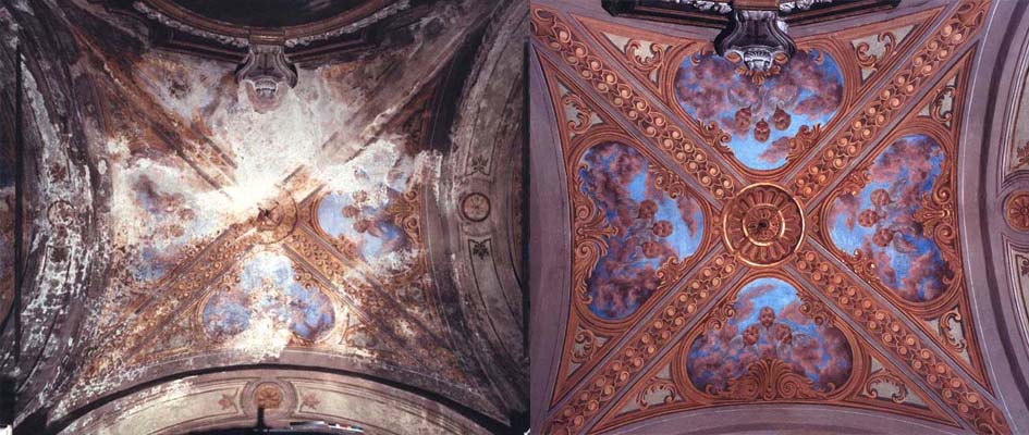 - ripristino formale delle decorazioni policrome con ricostruzione fedele del disegno originario e successiva protezione finale delle decorazioni
