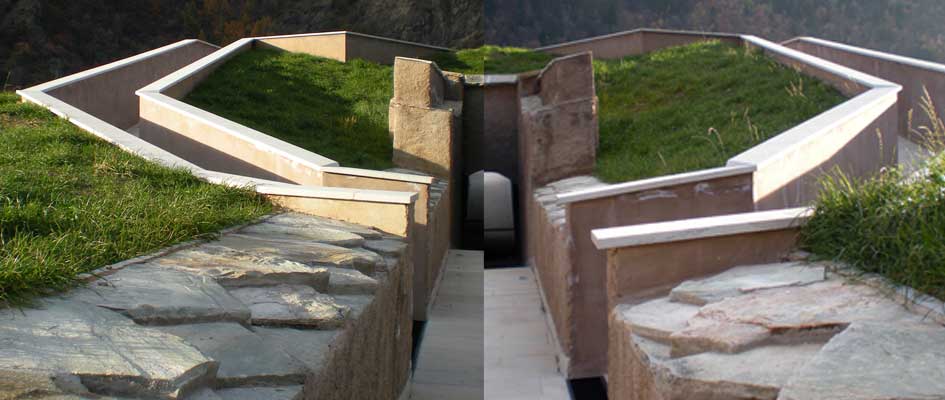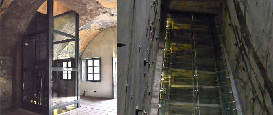 L’ascensore vetrato, scavato nella montagna e ad essa “unito”, diventa un segno visibile e riconoscibile anche nel paesaggio notturno. Il progetto interviene anche all’interno del cortile del Cavaliere con interventi di restauro conservativo, mirati a non stravolgere la natura dei locali, con l’introduzione di un nuovo ascensore vetrato posto all’interno della Testata Ovest che conduce i visitatori ad una nuova terrazza panoramica.