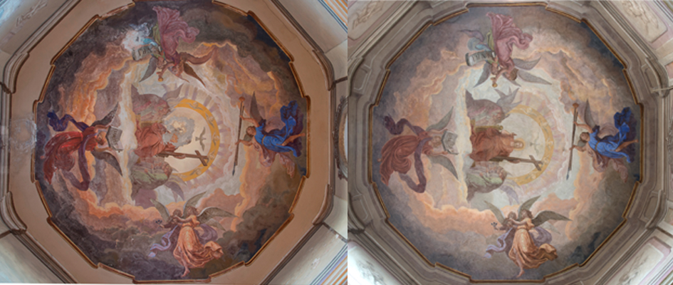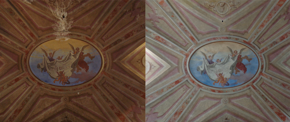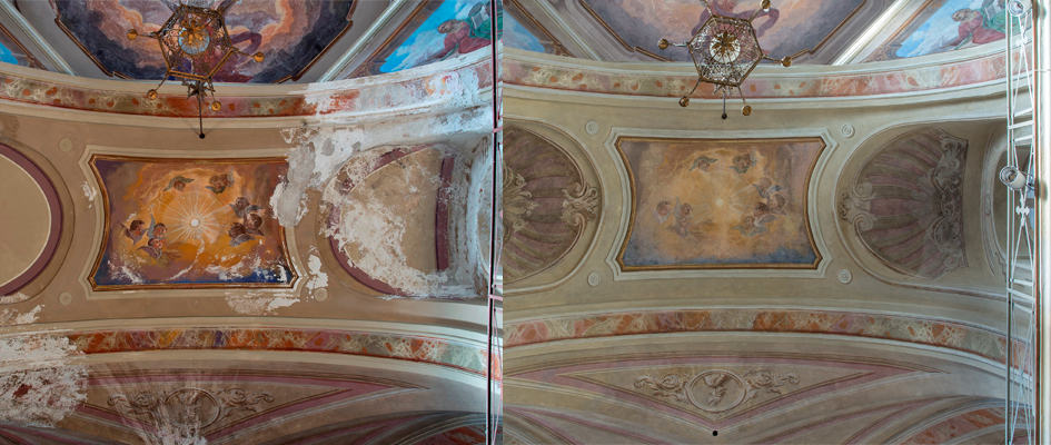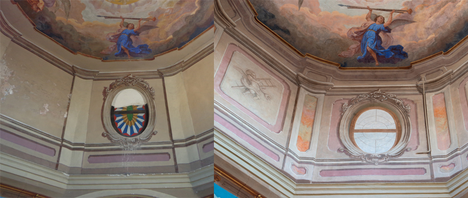 A seguito del montaggio dei ponteggi e dell’approfondimento diagnostico eseguito all’avvio del cantiere principale e preliminarmente all’inizio delle opere, si è esteso l’intervento alle aree attigue, tamburo e plafone, l’intervento è stato di notevole importanza per la qualità dell’opera, ed ha aumentato la leggibilità delle opere nel loro complesso.