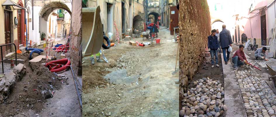 In accordo con la Committenza e la Soprintendenza si é proposto la posa in opera di una pavimentazione in ciottoli e materiale lapideo per colmare l’irregolarità delle cortine murarie. Questa soluzione tecnica, nata come semplice risposta ad una serie di esigenze pratiche, nel momento in cui il percorso della strada attraversava o incontrava un elemento di particolare pregio storico-scultoreo-architettonico caratterizzante il tessuto urbano del Centro Storico, ha rilevato le notevoli potenzialità decorative dei ciottoli.